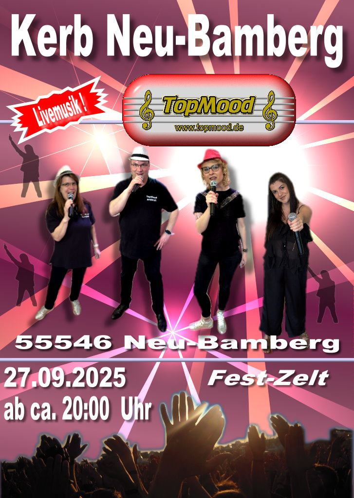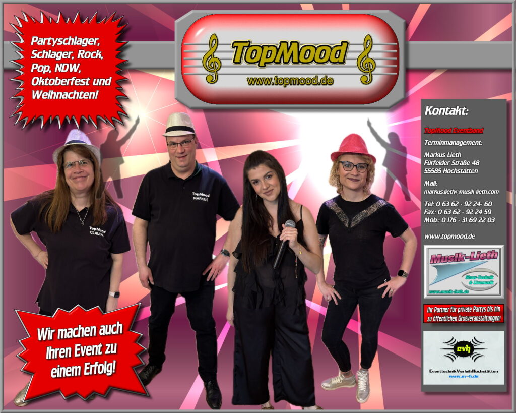 Veranstaltung, wir bieten für jeden Event die passende musikalische Untermalung. Gerne stimmen wir auch individuelle Wünsche mit Ihnen ab. Die Gruppe hat ihren Sitz in Hochstätten, dem Tor zur Pfalz. Die Sängerinnen und Sänger blicken teilweise auf eine langjährige Bühnenerfahrung zurück. TopMood kann Deutschlandweit gebucht werden und scheut sich auch nicht vor dem Ausland.